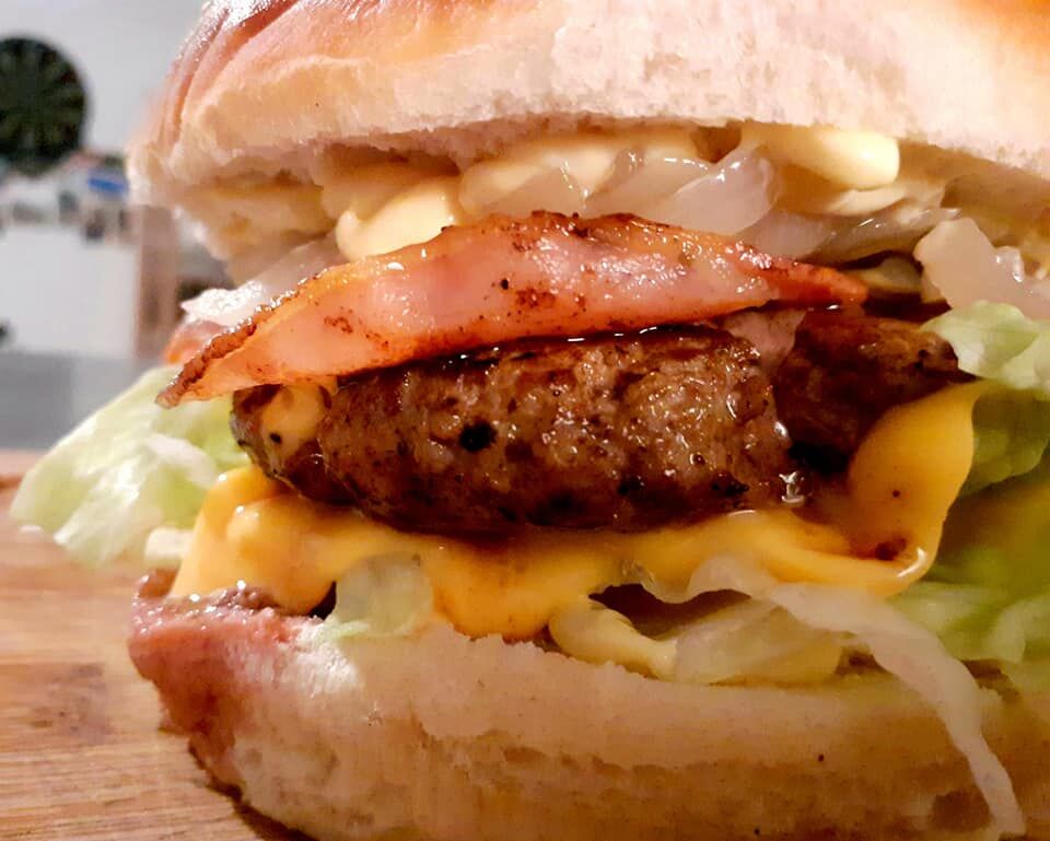 Nos délicieux Burger maison ( bœuf haché du boucher, salade, oignons confits, bacon, cheddar) Pain : Boulangerie du Bonheur